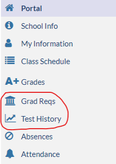 5. On the left, click "Grad Reqs" to see your credits and "Test History" to see your scores (pictured on the right).